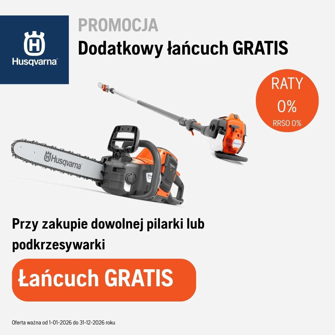 Teraz, przy zakupie dowolnej pilarki lub podkrzesywarki dodatkowy łańcuch otrzymasz GRATIS. Oferta ważna do 31.12.2026 roku lub wyczerpania zapasów.