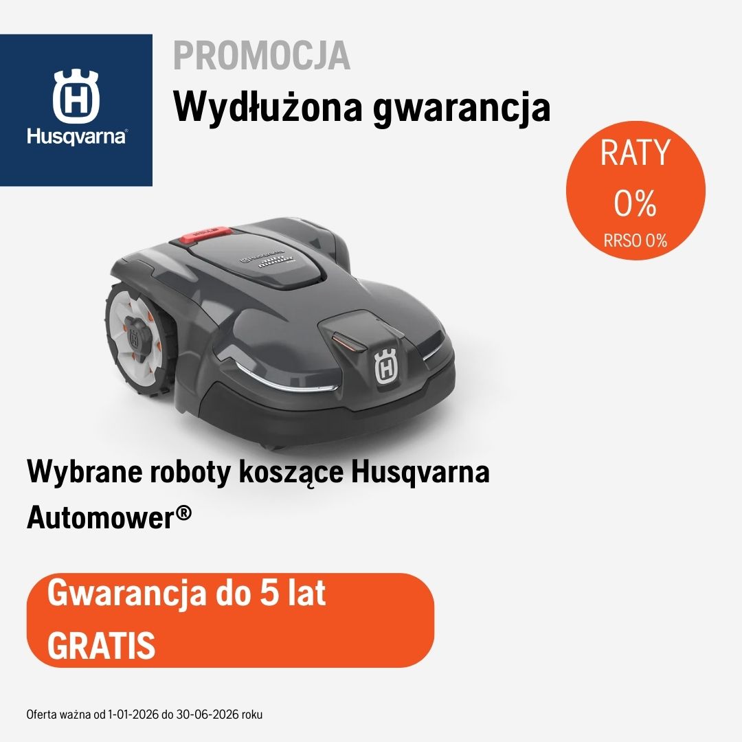 Tylko teraz przy zakupie wybranych robotów koszących Husqvarna Automower® otrzymasz wydłużoną gwarancję do 5 lat - GRATIS! Oferta ważna do 30.06.2026 i dotyczy klientów indywidualnych.